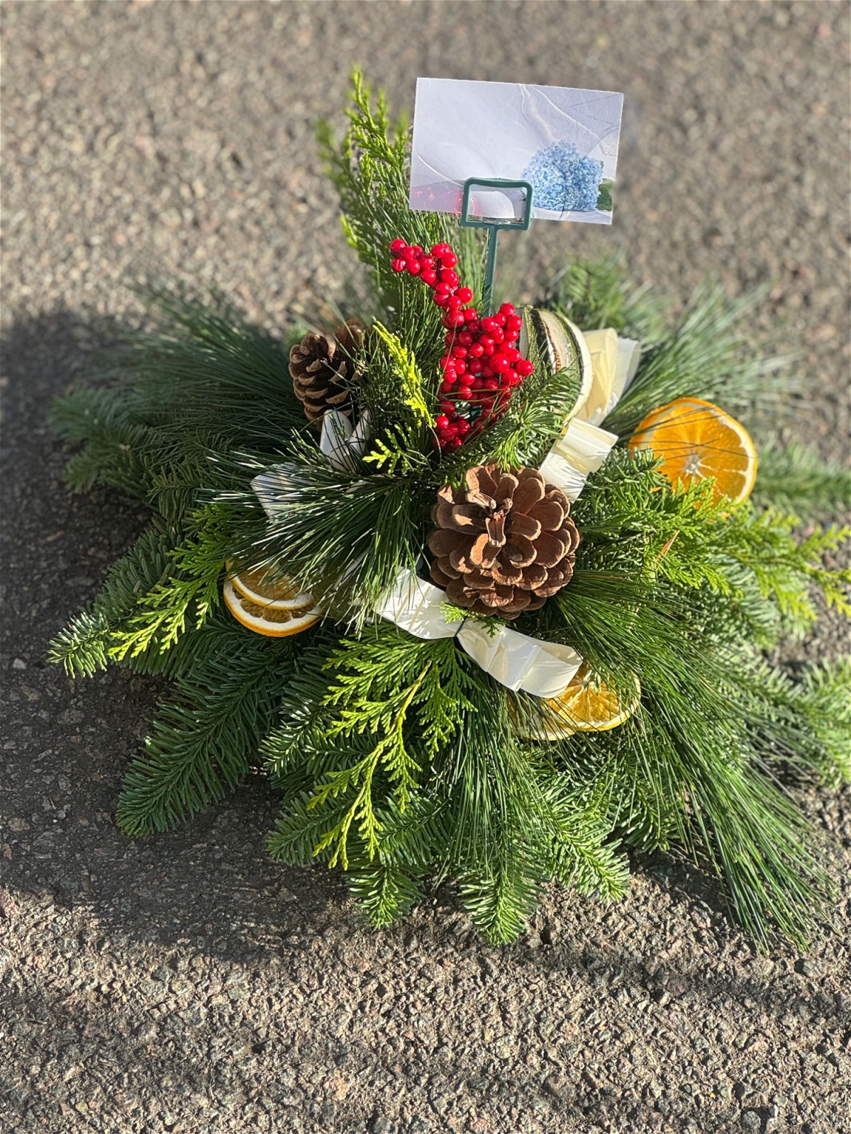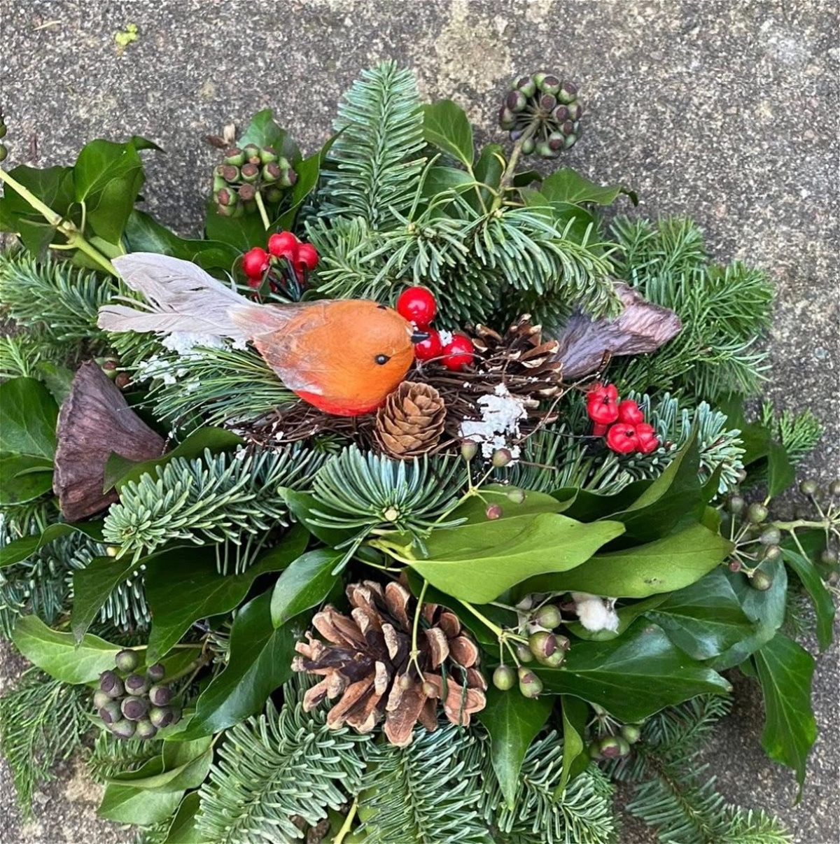 I’m also offering crematorium petite posies — a smaller, delicate tribute designed especially for crematorium plots and small memorial spaces. These are created in the same natural, festive style and make a lovely, understated remembrance piece.