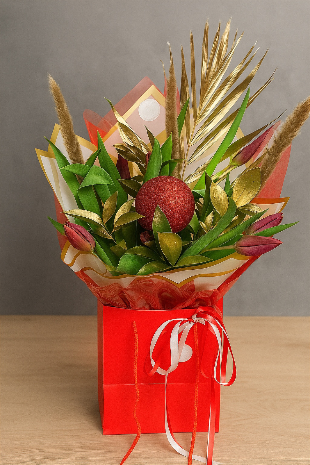 Introducing Santa’s Tulip Kisses — a bold, modern twist on Christmas florals. Featuring luxury tulips, shimmering gold foliage and a festive bauble, all wrapped in our signature What The Flowers style. A perfect way to send a little sparkle this season.